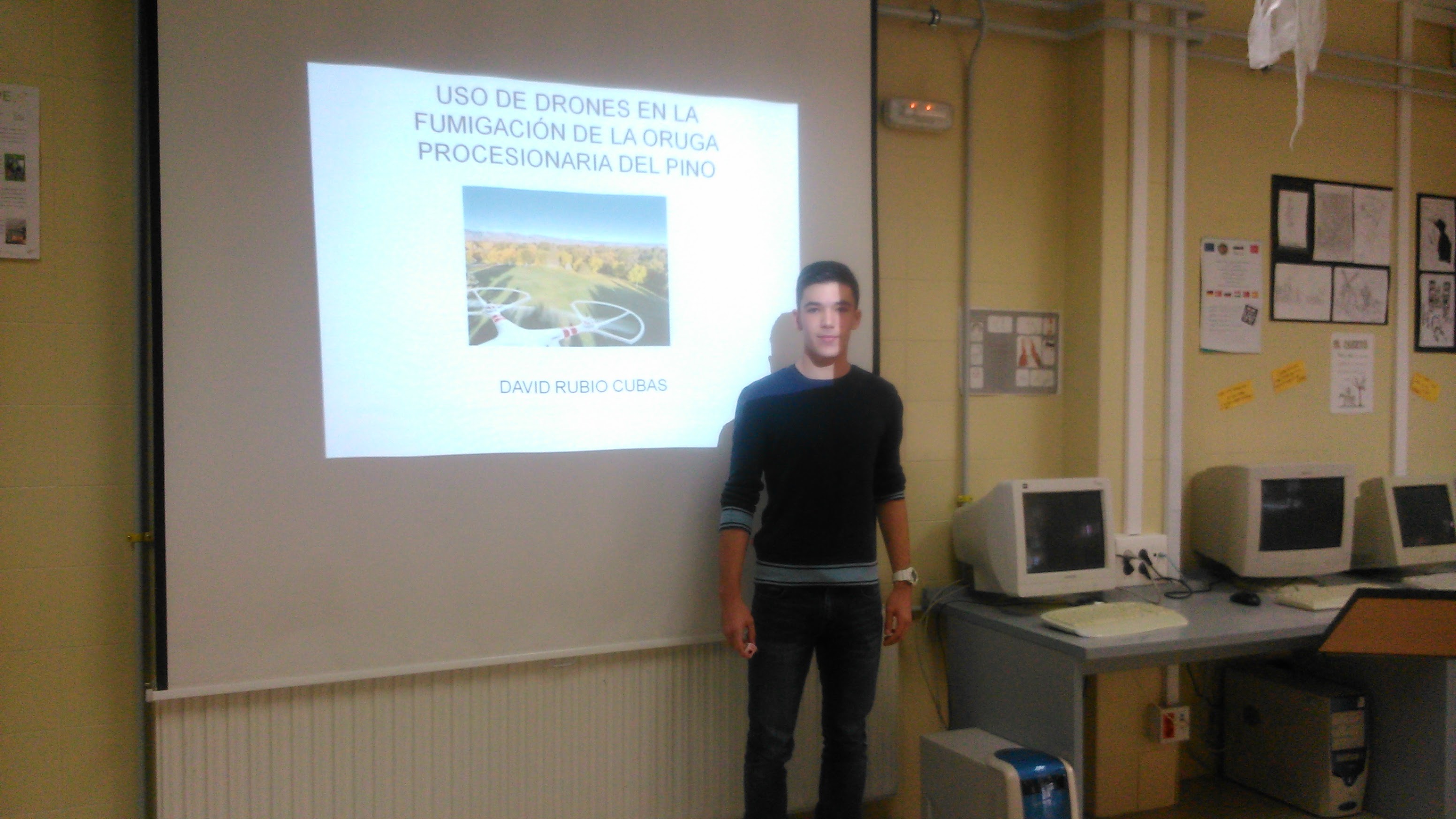 David Rubio de 2º Bach A ha presentado su proyecto «Uso de drones en la fumigación de la oruga procesionaria del pino», dirigido por Marisa García.