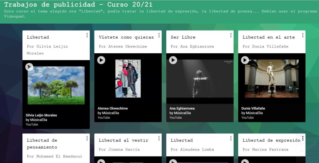 Los alumnos de 4º de música del IES Valmayor, han creado anuncios publicitarios en los que reflexionaban sobre la libertad. Unos han trabajado la libertad de expresión, otros la libertad en el arte, a la hora de vestir, libertad de pensamiento…