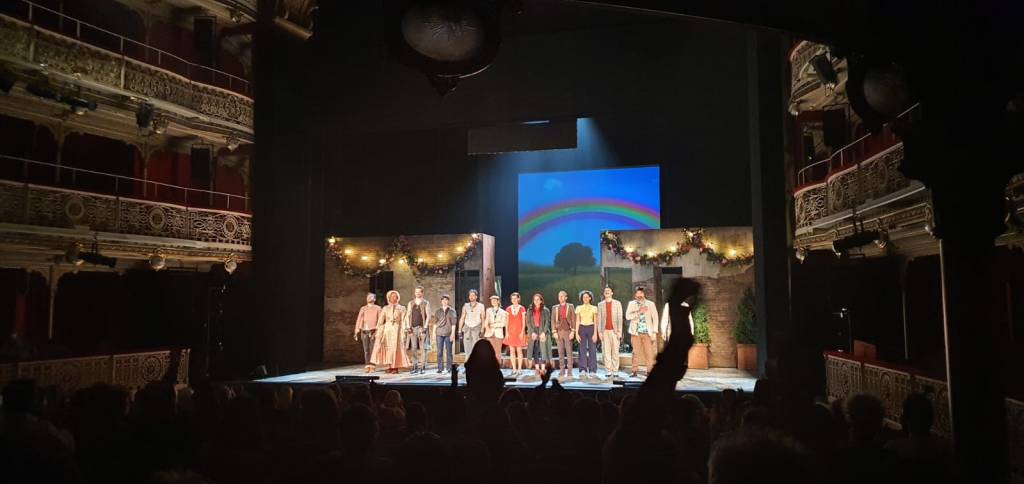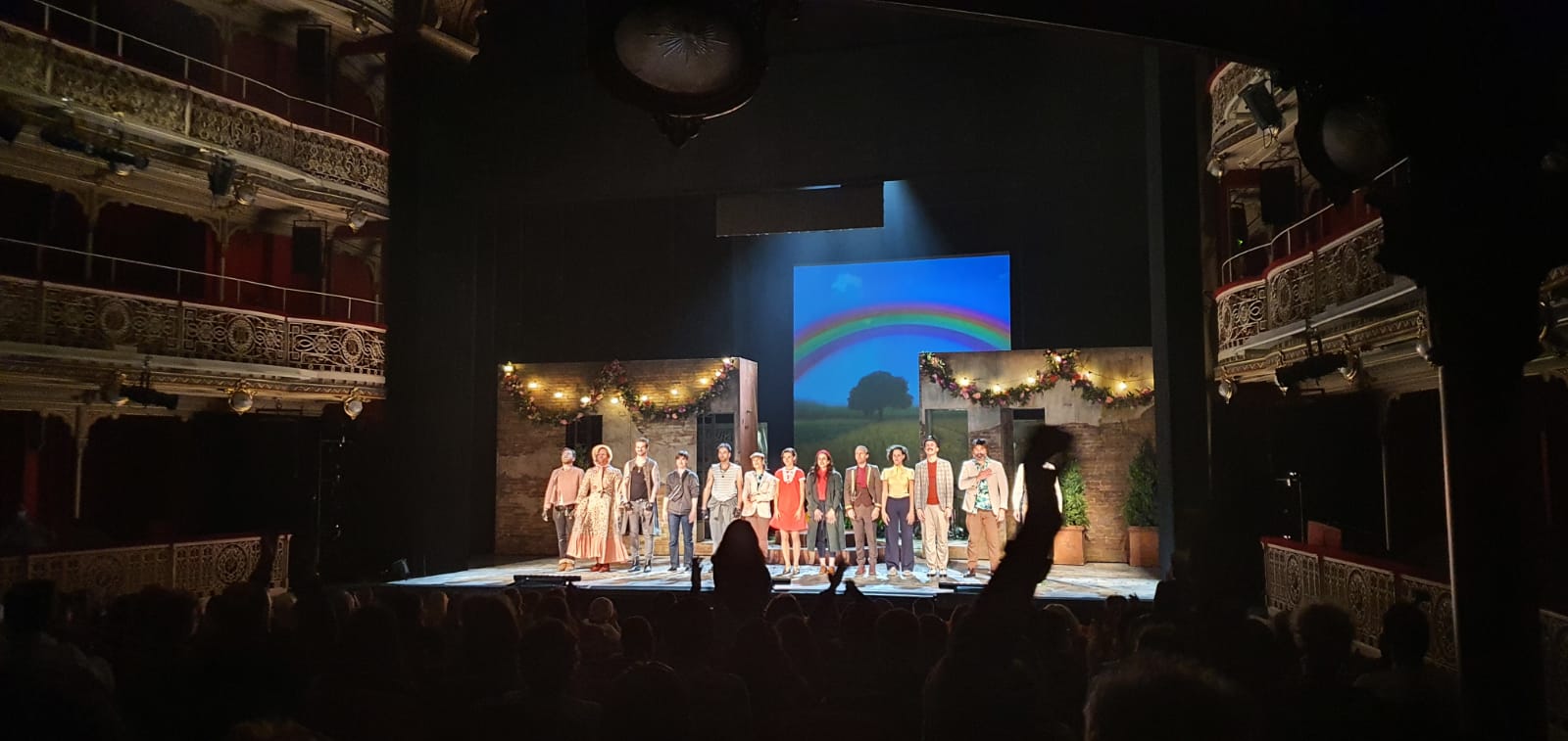 El martes 20 de abril un grupo de 60 personas, gracias a la iniciativa de Raquel Torres, Jefa del Departamento de Lengua del IES Valmayor, acudimos juntos al Teatro de la Comedia, donde se representa «Castelvines y Monteses», de Lope de Vega. Disfrutamos mucho de esta adaptación valiente y de estos actores que se entregan por entero durante las dos horas y media de espectáculo. ¡Qué bien nos vienen espectáculos alegres y vitales!¡ Qué lujo ver a estos profesionales actuar, cantar, tocar instrumentos, bailar en escena…!