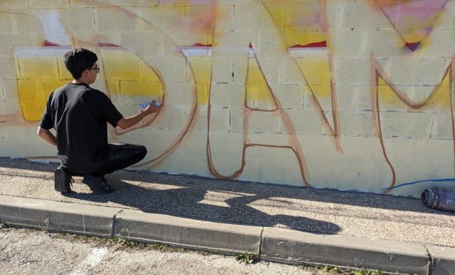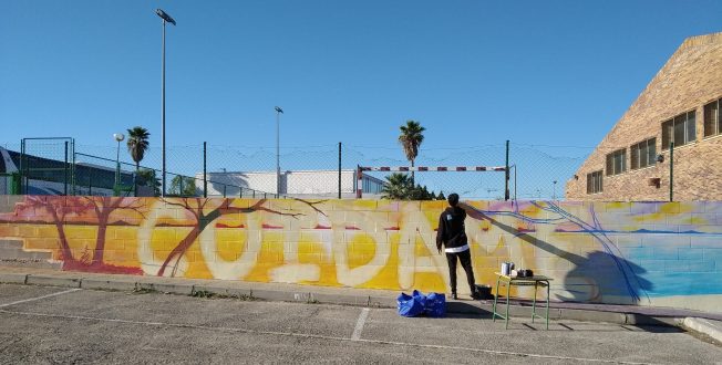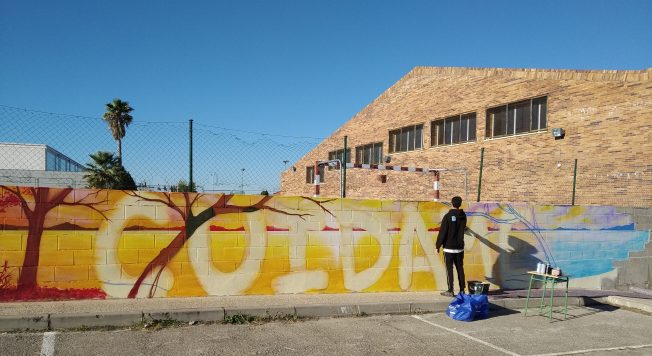 Después del estupendo trabajo de arte en muro realizado en la pared que da a la carretera, Alon ha vuelto para realizar otro mural en la parte del patio que ha pasado a ser el lugar de recreo de los alumnos de 3º y 4º, y que está siendo completamente renovado.