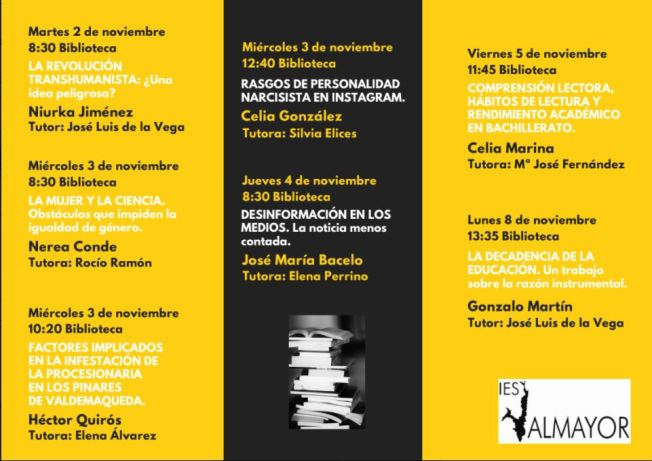 Como novedad, este año los alumnos participantes defenderán los trabajos en horario lectivo para que sus compañeros de 1º de Bachillerato, futuros participantes en el proyecto, puedan asistir, informarse y aprender de ellos.