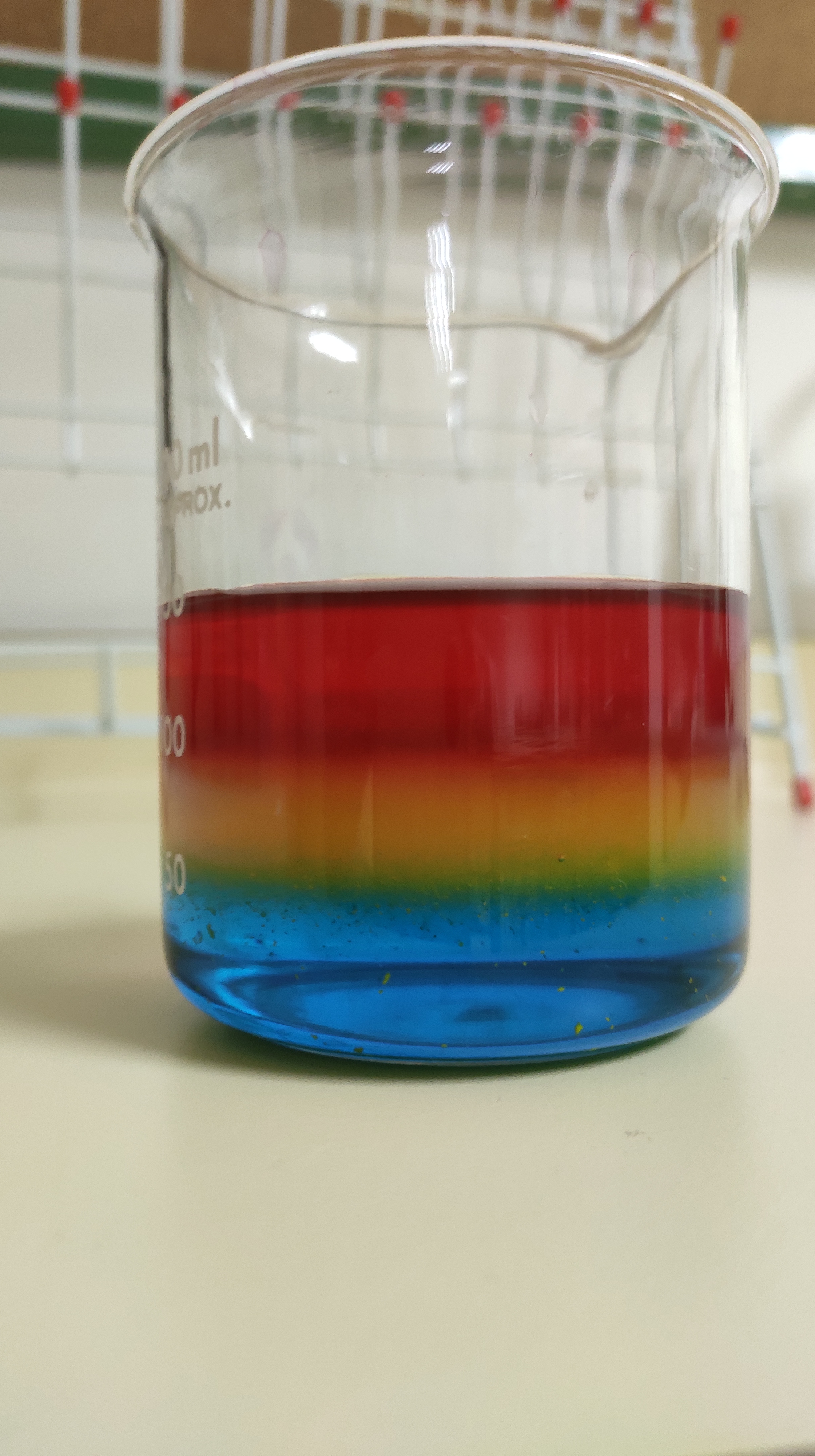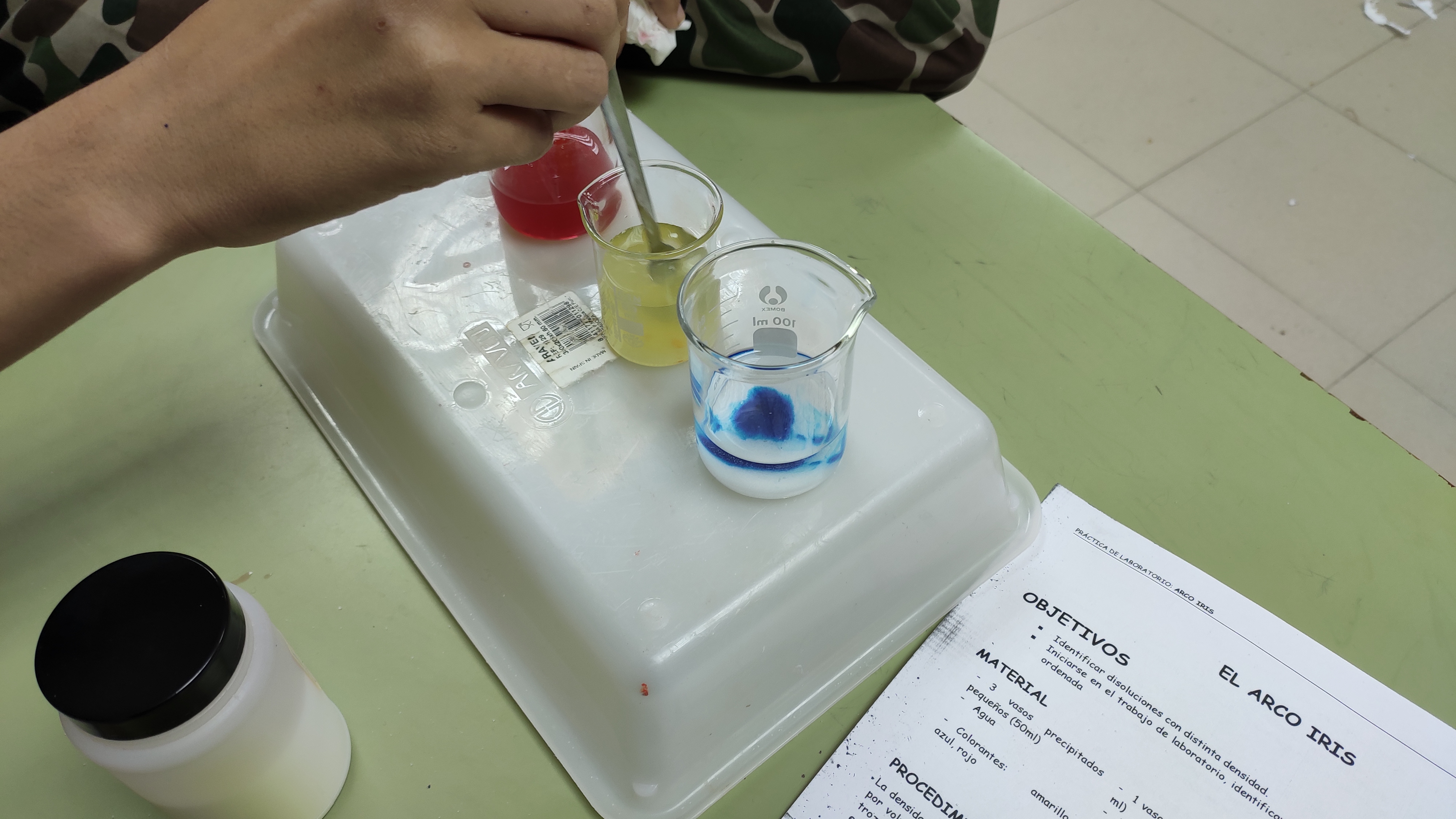 Echa la disolución roja, luego la amarilla y por último la azul. Si te das cuenta empezamos con la disolución que tiene menos sal (menos concentrada) y continuamos con las que tienen más sal. PRECAUCIÓN: Debes ser muy cuidadoso. La primera la podemos echar de una vez. Las siguientes hay que añadir gota a gota con mucho cuidado que no se mezclen.