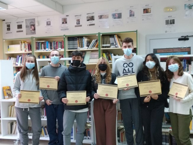 El martes 16, durante el recreo, se entregaron los diplomas a los alumnos de 2º de Bach que han finalizado y presentado sus Proyectos de Investigación: Nerea Conde, Niurka Jiménez, Celia González, Gonzalo Martín, Héctor Quirós, Celia Marina y José María Bacelo.