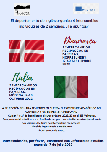 En el marco del programa Erasmus +, el IES Valmayor a través del departamento de inglés ha organizado 4 intercambios recíprocos a Italia y Dinamarca de dos semanas de duración durante el primer trimestre de 2022. Tras la baja de una alumna, tenemos una plaza vacante para viajar a Dinamarca entre el 19 y el 30 de septiembre de 2022 y abrimos la convocatoria a alumnos/as de 2º bachillerato.