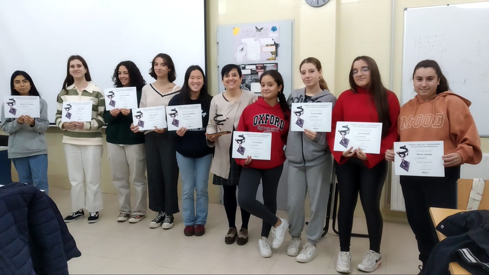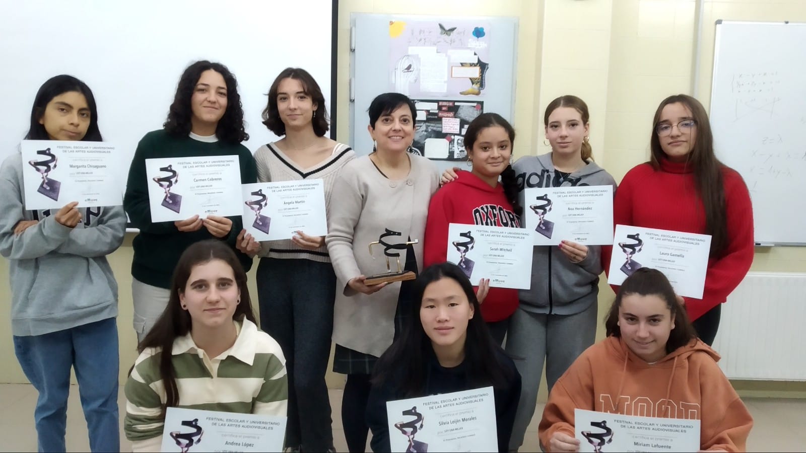 Nuestra enhorabuena a Margarita, Andrea, Carmen, Ángela, Silvia Leijin, Sarah, Noa, Laura, Miriam y el resto de alumnas participantes en el corto «Soy una mujer» premiado en el Festival Emove. Al resto de alumnas que ya no estáis en Valmayor os haremos llegar los diplomas.