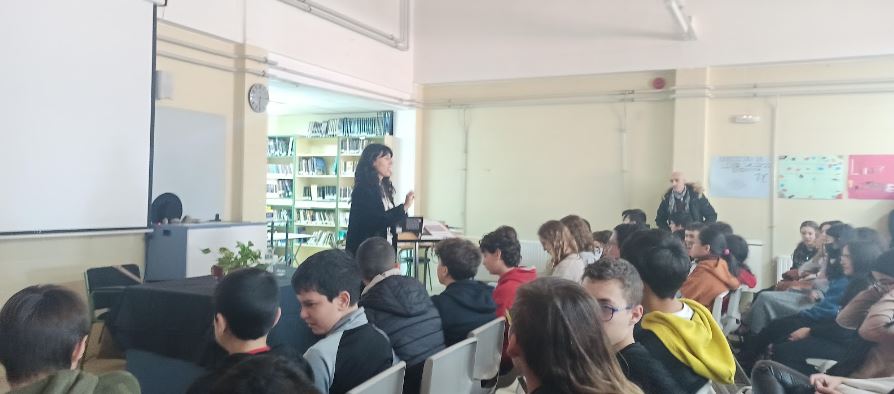 Así presentaban nuestras alumnas Lorea Sotillo y Ruth Montero a Raquel Lanseros que el pasado viernes con Erató, la musa de la poesía, estuvo en Macondo, nuestra biblioteca.