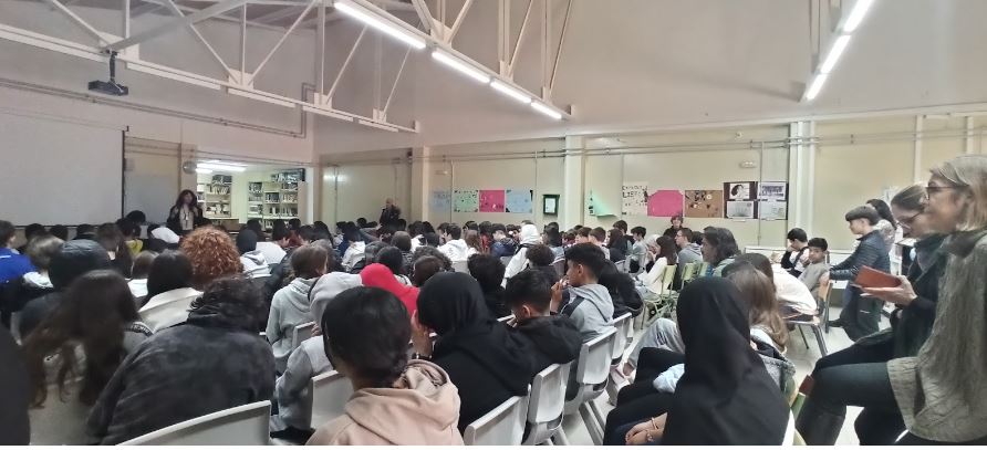 Luego pidió a los alumnos, que como siempre habían elaborado los murales donde recogen su biografía y producción lírica, que le propusieran algún tema para defenderlo con sus versos que leyó al auditorio. Así disfrutamos de los poemas de Lanseros vinculados con la vida y la memoria.