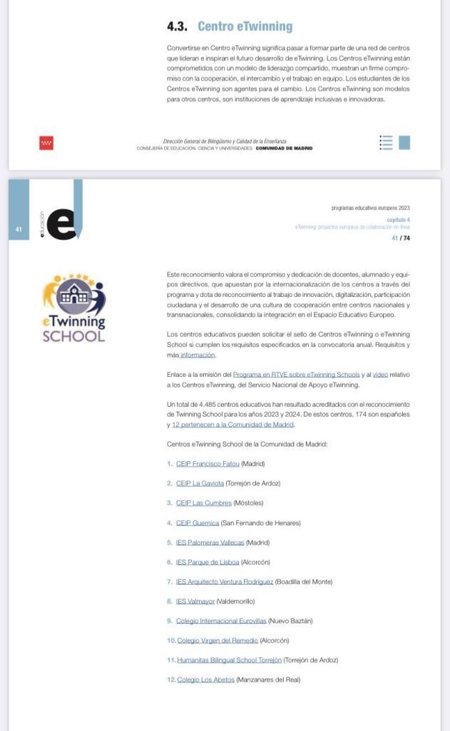 Estamos de enhorabuena. Este martes 23 de abril, día del libro, la consejería de Educación Ciencia y Universidades ha publicado el libro «PROGRAMAS EDUCATIVOS EUROPEOS 2023» en el que aparece nuestro centro, su labor internacional y su categoría de centro etwinning.