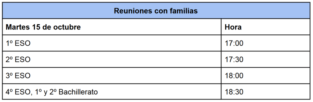 Reuniones de inicio de curso con familias 7Oct 2024Añadir un comentario El martes 15 se realizarán en el centro las reuniones colectivas con las familias del alumnado de cada curso de la ESO y Bachillerato, en los siguientes horarios: Me gusta Cargando... Relacionado