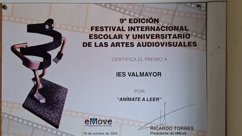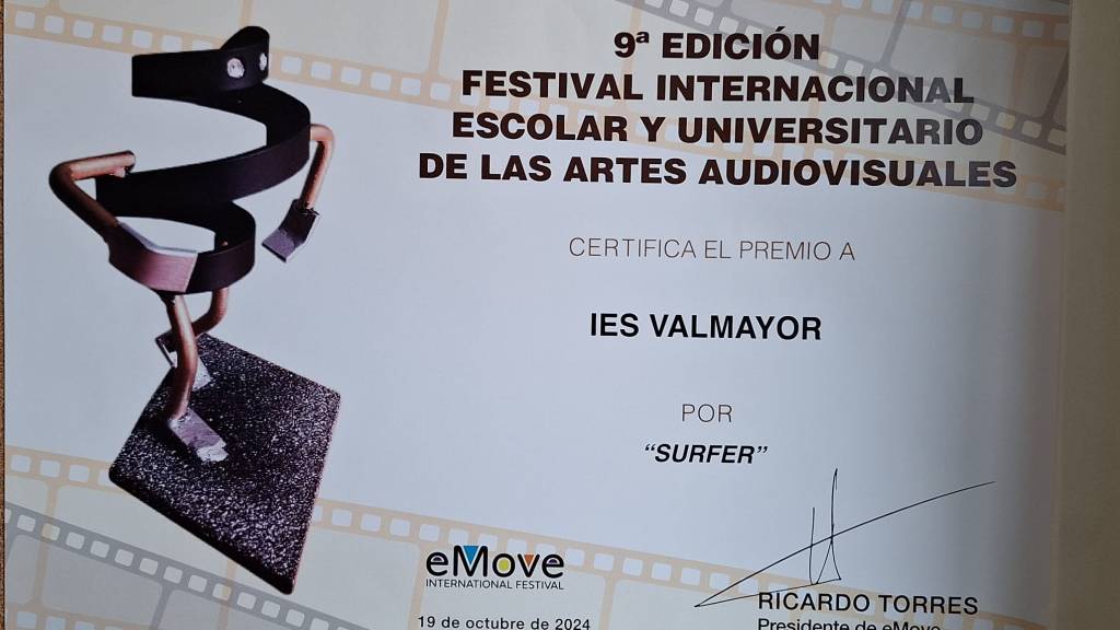 A pesar de competir con más de 1000 obras presentadas, nos otorgaron el premio al mejor videoclip «Surfer» en la categoría de Bachillerato, realizado por Arturo Herrero, y al mejor reportaje «Anímate a leer» en la categoría de Secundaria, realizado por todos los alumnos que cursaban la optativa Creación de cortos en 4º de ESO el curso pasado.