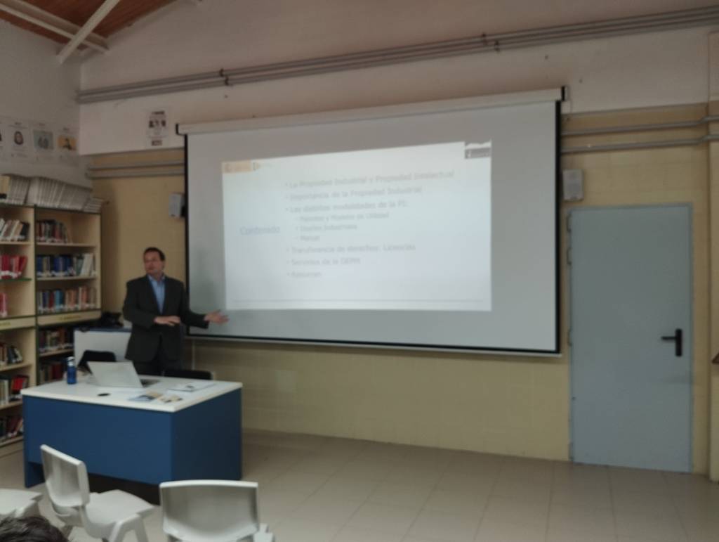 La Oficina Española de Patentes y Marcas a través del ponente León Mena nos ha impartido una interesante charla el martes 5 noviembre sobre Propiedad Industrial en general, acercando el tema de las patentes, marcas y diseños industriales a nuestros alumnos de 1º bach, 2º bach y FP.
