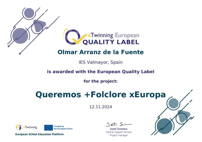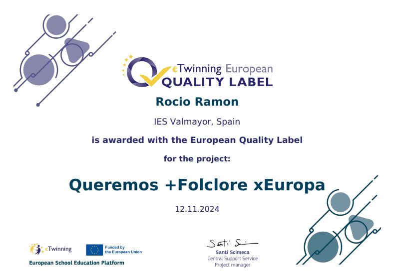 Estamos de enhorabuena. Un año más y de manera consecutiva nos han concedido el sello europeo de calidad Etwinning por nuestro proyecto “Queremos +Folclore xEuropa”.