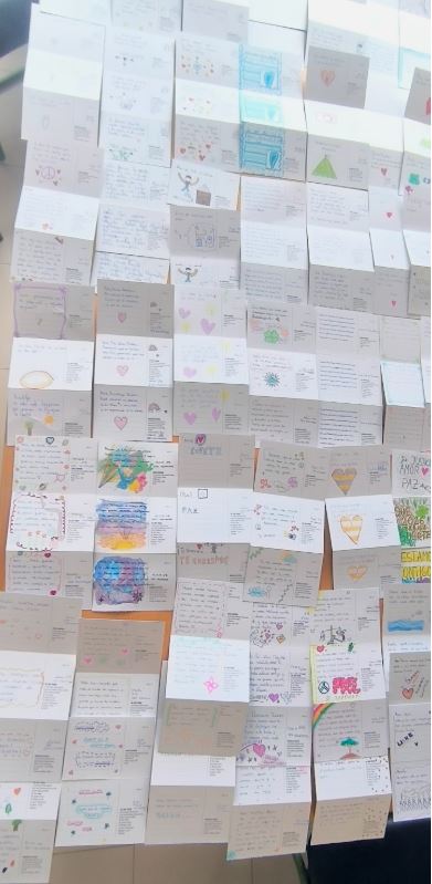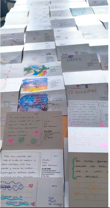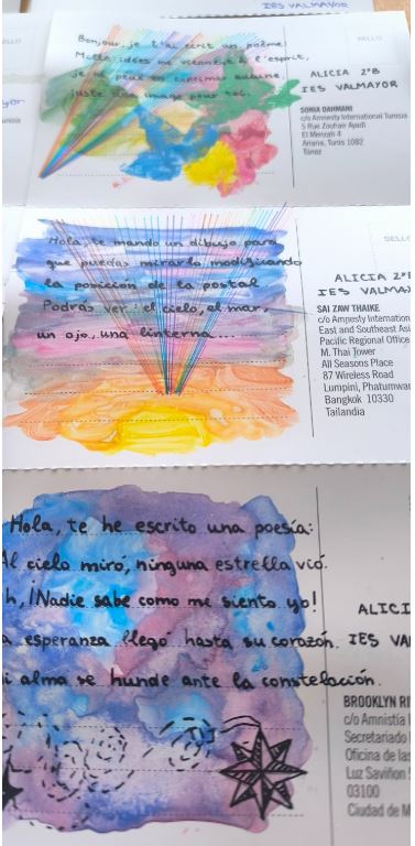 Nuestros alumnos, han escrito, dibujado y coloreado mensajes en esas postales, con palabras como libertad, ánimo, justicia, con el propósito de que les lleguen a sus destinatarios, en la creencia de que estas acciones basadas en la palabra, sean una ariete que derribe la intolerancia de los gobiernos antidemocráticos, para que revisen y liberen a estas tres personas. También con la intención de animar a las víctimas que se encuentran en esta lamentable situación.