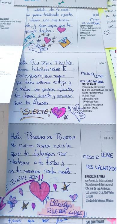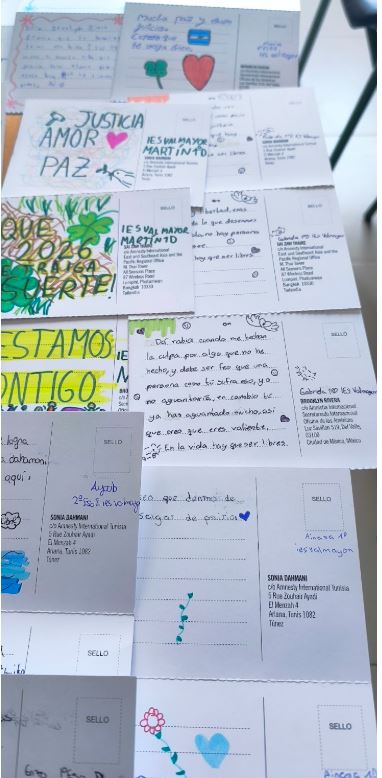 En las aulas hemos trabajado con los tres casos propuestos este año:Sonia Dahmani, Sai Zqw Thaike y Brooklyn Rivera, para enviarles mensajes de ánimo y apoyo ante su terrible situación, en la que se han vulnerado todos los derechos humanos.