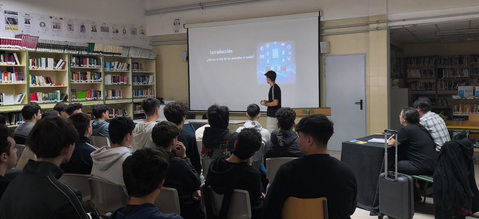 El 31 de octubre, Gael Sotillo expuso su proyecto de investigación, mediante el cual hizo un estudio sobre como el uso de las pantallas afectaba al sueño, para ello realizó una serie de encuestas a los miembros de la comunidad educativa del IES Valmayor, durante su exposición nos contó lo importante que es el sueño, desde un punto de vista fisiológico y psicológico y los resultados obtenidos, entre los que cabe destacar que un uso prolongado de las pantallas a lo largo del día y principalmente antes de dormir, puede influir de manera negativa en el sueño.